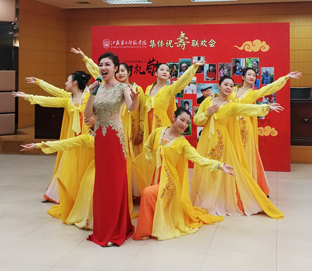 祝寿会在音乐学院教师肖园园演唱的《领航新时代》中拉开帷幕。