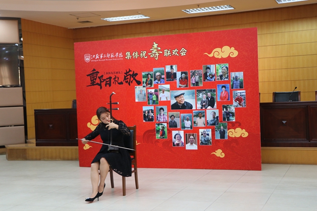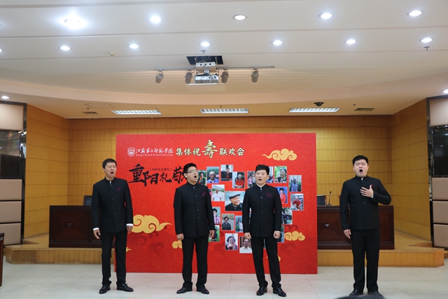 大学生艺术教育中心表演了精彩的节目,音乐学院教师龚楠二胡独奏《赛马》、TNT组合的男生四重唱《祖国万岁》、《校歌》把祝寿会气氛推向高潮。