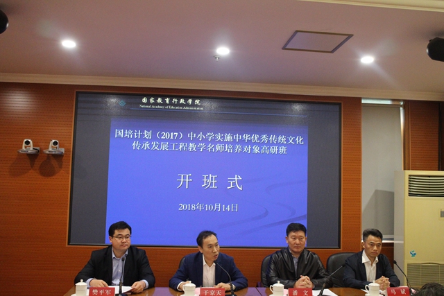 10月13日至17日,由我院承办的教育部示范性国培项目、“跨年度、递进式、混合型”中小学“实施中华优秀传统文化传承发展工程”教学名师培养对象高级研修班在北京举行,这是50名学员继在南京、常州以及苏州以后的第四次集中培训,为期5天。14日上午举行了开班典礼,国家教育行政学院副院长于京天、江苏省教育厅师资处处长马斌、我校副校长潘文分别讲话;开班典礼由国家教育行政学院远程培训中心主任樊平军主持。