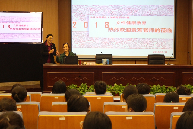 10月31日下午,生化学院在草场门校区现代教育技术大楼二楼报告厅举办“女性健康教育”讲座,校卫生所原所长袁芳应邀主讲。该院党总支书记陈建琴主持活动,来自5个专业的153名大一女生参加活动。
