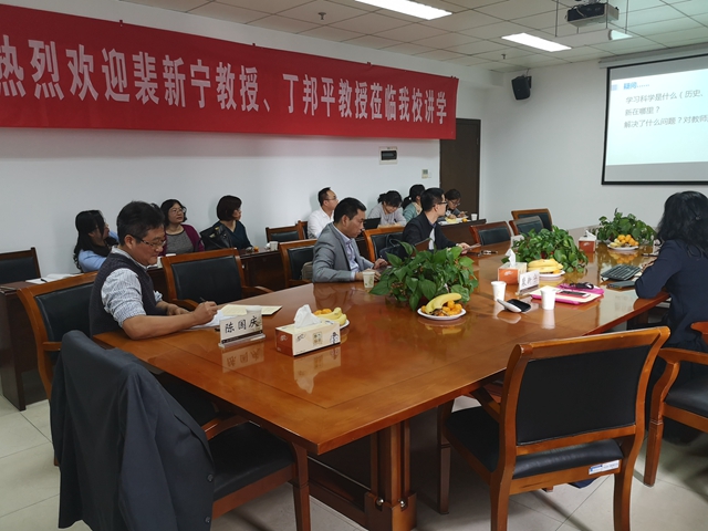 为浓厚学术氛围,了解最新学术研究前沿发展动态,提高教师专业研究水平,11月4日,教育科学学院举办专题科研学术活动,邀请华东师范大学博导裴新宁教授、首都师范大学博导丁邦平教授来校,为全体教师作学习科学和国际比较教育新进展主题学术报告。原副校长张勤、南京大学教科院张红霞教授以及教科院全体教师参加活动。
