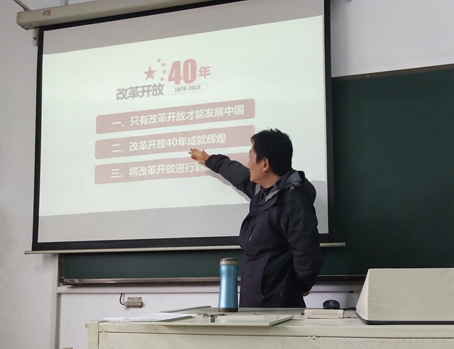 徐孝彬从同学们的生活切入,比较了两代人在吃、住、行等方面的巨大变化,讲述了改革开放四十年沧海桑田的变化,阐述了三个方面内容:一、只有改革开放才能发展中国。改革开放是中国的第二次革命,促进现代化事业和社会主义事业的发展;改革开放是解放和发展生产力的必然要求,是适应新科技革命和时代发展的必然要求。二、改革开放40年的辉煌成就。从封闭性经济弱国到开放性全球经济大国,中国迅速成长跃升为世界第二大经济体;从贫穷到温饱再到整体小康,居民收入不断迈上新台阶,人们的需求层次越来越高;从世界舞台边缘日益走近世界舞台中央,2001年,加入世界贸易组织,成为中国全面重返世界舞台,融入全球化进程的标志性事件。三、将改革开放进行到底。坚定不移全面深化改革,走中国特色社会主义道路,强国之路,富民之路,以更大力度推进改革开放。