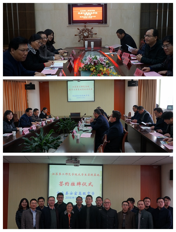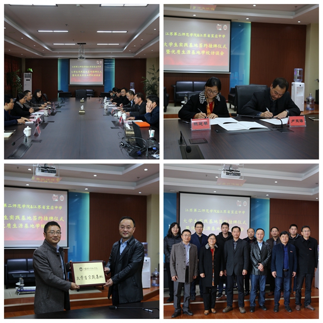 陈建琴代表学校分别与三所中学签署了共建大学生实践基地协议,花书贵向三所中学分别授予“江苏第二师范学院大学生实践基地”铜牌。