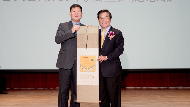 9日上午,潘文出席屏东大学5周年校庆大会并与屏东大学校长古源光互赠纪念品,同与会代表合影留念。
