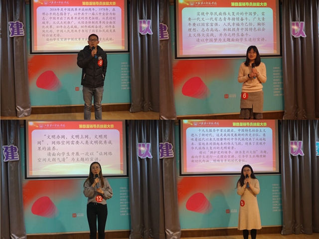 12月28日晚上,我校第四届辅导员技能大赛决赛在草场门校区艺体楼展厅举行,人事处处长周群、监察处处长卜玉平、宣传部部长李安林、招就处副处长司南、团委副书记刘姝担任评委。全体辅导员和部分学生代表观摩比赛。本次比赛还通过“易班学生工作站”官方QQ进行了同步直播。