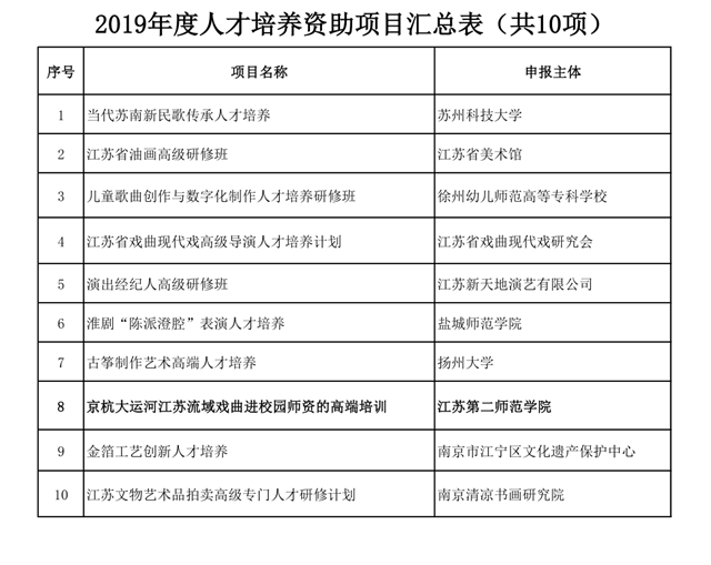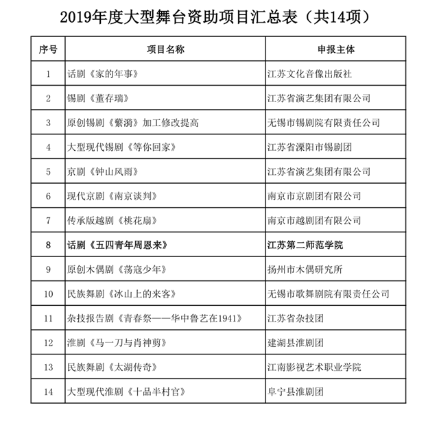 3月18日,根据《江苏艺术基金章程》及《江苏艺术基金使用和管理办法》,江苏艺术基金理事会审议通过我校大型原创话剧《五四青年周恩来》获得2019年度大型舞台资助项目立项、《京杭大运河江苏流域戏曲进校园师资的高端培训》获得2019年度人才培养资助立项。