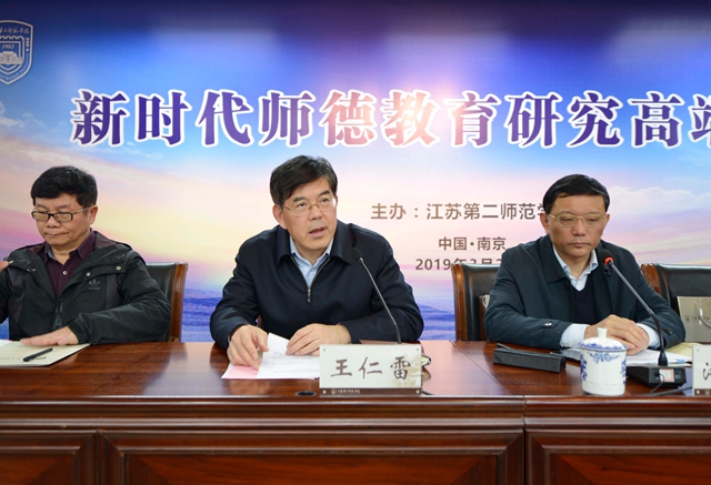 3月27日上午,我校主办新时代师德教育研究高端论坛。教育部教师工作司教师管理与师德建设处处长黄小华,江苏省教育厅副厅长潘漫,中国伦理学会教育伦理专业委员会会长、上海市师德研究与评价中心主任王正平,中国伦理学会教育伦理专业委员会秘书长、上海师范大学期刊社社长、总编何云峰,我校党委书记王仁雷,党委副书记、副校长刘继红出席论坛。新时代师德教育研究中心主任张勤主持论坛。来自全国的教育伦理学专家学者参加活动。