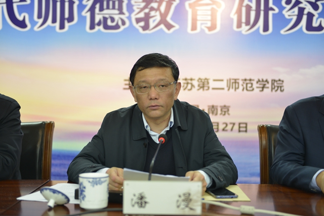 潘漫代表江苏省教育厅致辞。他肯定了我校在师德教育研究和实践方面开展的有益探索和取得的良好效果,并就办好师德教育研究中心提出几点要求:一是要坚持不懈加强学习。把加强师德师风建设和培养高素质师资队伍建设的新要求、高校教师师德准则和中小教师师德红线新规定领会全面,以便于指导中心开展工作。二是要不遗余力打造队伍。要采取多种形式和有效机制,吸引人才,促进学科和专业发展,引领和辐射江苏甚至全国的师德师风建设;要促进教师教育学科建设、专业发展,为江苏和全国输送高质量的、人民满意的师资。三是要坚定不移服务实践。要为师德培养、师能提升提供专业支持;为相关机构提供决策支持;为各级各类学校师德师风考核提供指导。四是要持之以恒拓宽视野。要发挥好“思想库”“信息库”和“人才库”的作用,为实现江苏高质量发展走在前列、进一步推动江苏师德教育研究与实践的繁荣发展做出积极贡献。