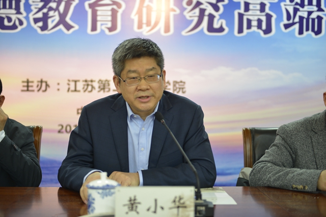 黄小华代表教育部教师工作司致辞。他强调了师德师风建设的重要性以及党的十八大以来中央对师德师风建设的重视程度。他指出,该中心的成立是江苏第二师范学院深入贯彻中央四号文件精神、加强师德师风建设的一个具体行动。他希望我校以中心的成立为契机,力争在师德理论、教师培训、评价监测等方面的理论研究有所升华,以解决实际问题,推动教师教育的改革创新;以举办此次论坛为契机,壮大研究队伍,将理论研究向纵深推进。他祝愿该中心早日建成国家级的品牌基地,为造就高素质、专业化、创新型教师队伍,建设教育现代化强国作出贡献。
