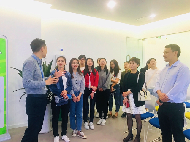龚晨介绍了空中英语的办学情况并带领大家参观了校区。师生一行观摩了空中英语hriam老师的一堂示范课。观摩课结束后,双方师生进行了座谈,该校綦园君主管和龚晨校长分别介绍了空中英语课程体系以及薪酬、晋升等情况,并回答了同学们关心的问题。黄晓波作总结,他鼓励同学们要注重自身专业技能的锻炼和提高,要学习实践单位积极向上的企业文化和运营机制,为今后的职业生涯发展积累经验。