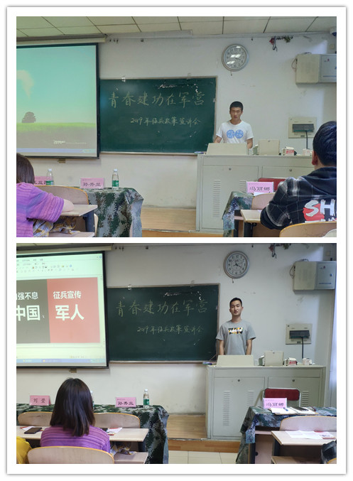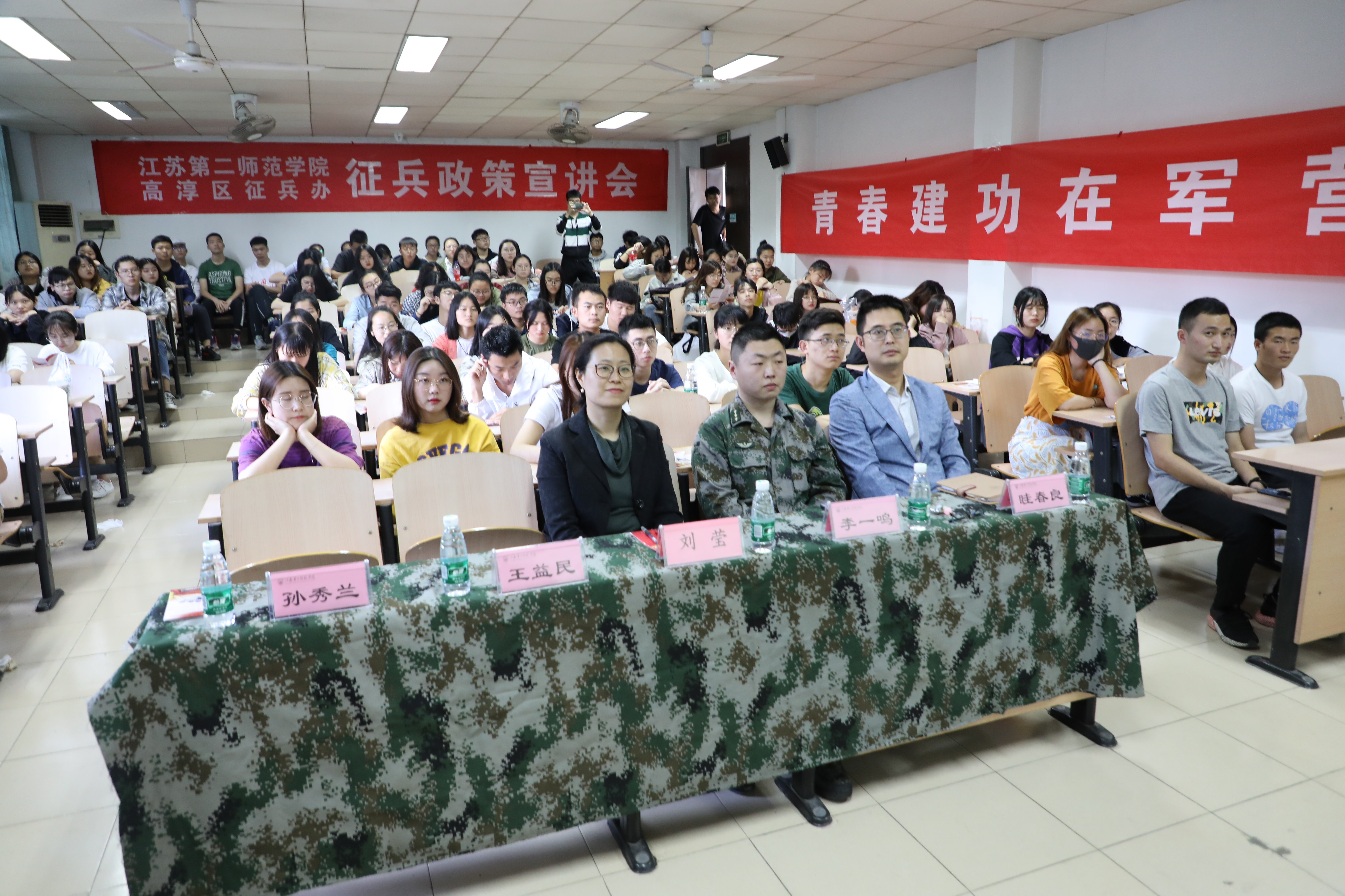 高淳区征兵办王益民参谋、孙秀兰干事担任主讲并回答了学生的提问。宣讲会后,我校生命科学与化学化工学院17级小学教育(科学)专业的葛东雷同学和教育科学学院18级小学教育专业的许雨志同学作为退役大学生代表与现场110余名学生分享了他们的从军经历,同学们备受鼓舞,从军热情高涨。