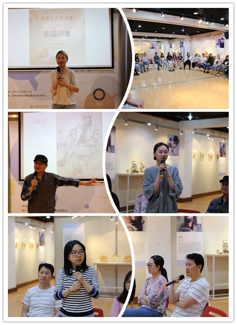 5月20日下午,美术学院举办“新青年艺术沙龙——素描印象”。院党总支书记丁莹、美院二级关工委副主任黄载文、美术学专业教师孙仕荣、视觉传达设计专业教师闫彦、学工办副主任白丽以及17级美术学普本班全体同学参加沙龙。
