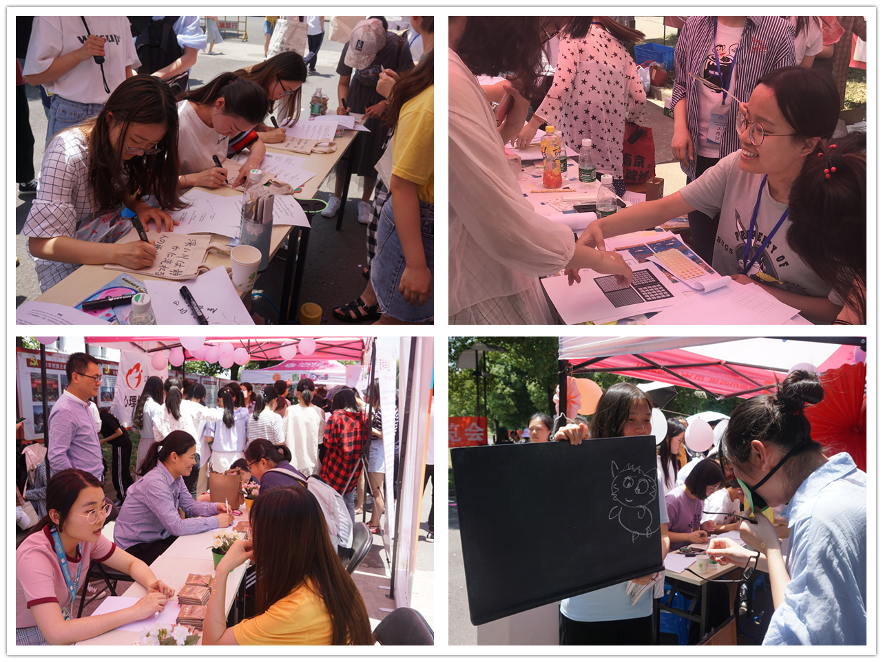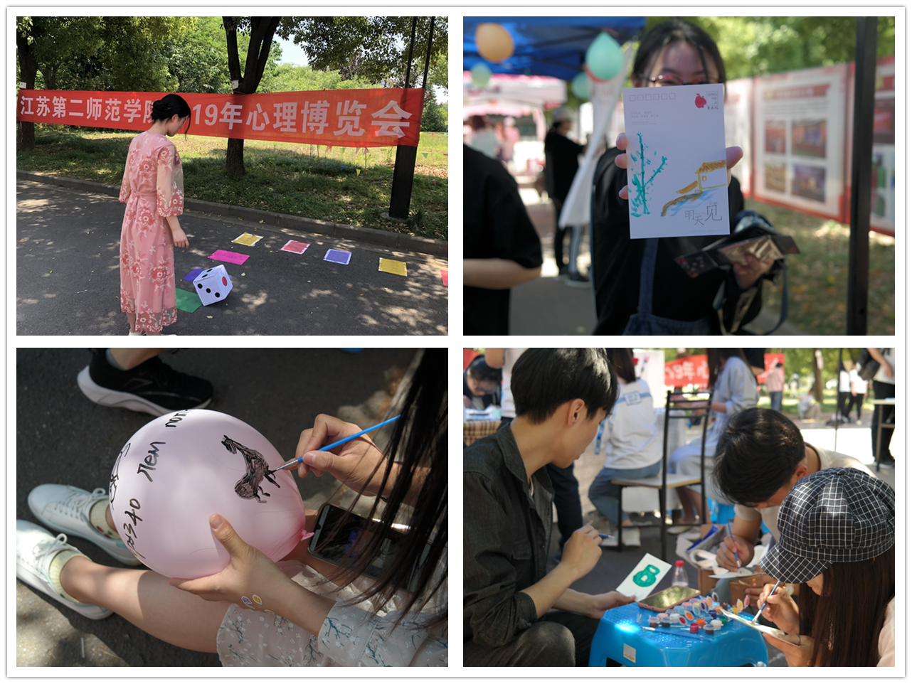 活动由浦口校区心理健康协会、学院心理气象站承办。各学院发挥专业特长,在普及心理知识的同时,开展丰富多彩的体验活动。教育科学学院组织现场同学开展了“自画像”、“命运纸牌”等活动,引导同学们通过不同的方式探索自我,了解自我。外国语学院“Close Your Sense”活动通过封闭部分感官,完成指定动作,让同学们更加细致地体会自身与外界的连接。文学院“星语心愿”活动请同学们将自己的情绪写下,放在漂流瓶里带在身边,引导同学们体察自己的情绪,学会和自己的情绪相处。马克思主义学院进行了木片绘画和明信片撰写活动,让同学们学会表达,尝试用多种方式和他人沟通。经法学院的“思维方式辨识”和主题彩绘活动,让同学们体会不同思维方式碰撞带来的火花。心理健康协会开展了“心理大富翁”、心理名言书签撰写和“100天行动计划”等活动,带领同学们体会了一段丰富多彩的心理旅程。在此次心博会中,针对毕业季学生所处的心理状态,心理中心也面向今年和明年的毕业生开展了现场咨询和“面对毕业我想说”留言活动,帮助学生更好地应对毕业季的相关心理困扰。