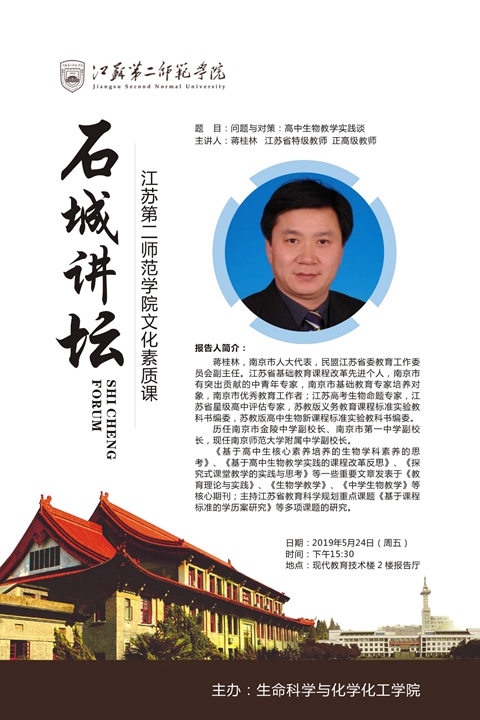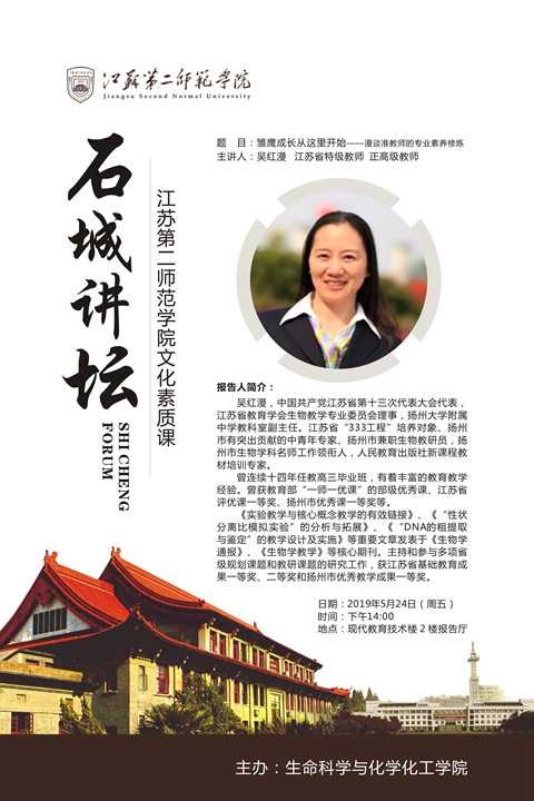 5月24日,生化学院举办“石城讲坛”大学生文化素质课活动,邀请省特级教师吴红漫、蒋桂林来校,为2016、2017级生物科学师范专业的同学作了“雏鹰成长从这里开始—漫谈准教师的专业素养修炼” “问题与对策:高中生物教学实践谈”的专题讲座。院长蒋功成、党总支书记陈建琴、副院长朱学伸,南京市教研室生物特级教师岑芳等多位老师出席活动。该院高学林老师主持活动。