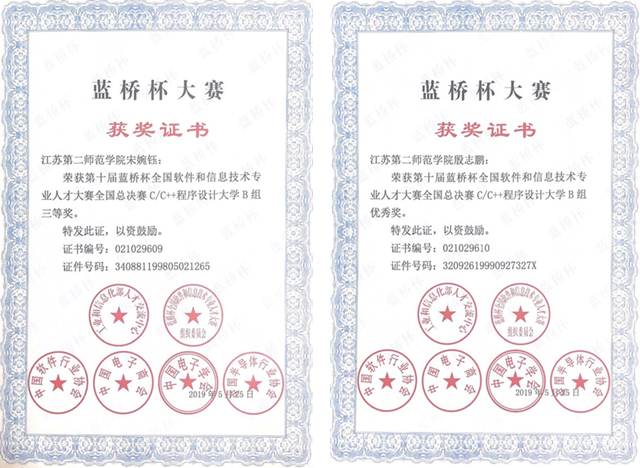 5月25日,第十届蓝桥杯全国软件和信息技术专业人才大赛总决赛在北京举行,来自北京大学、清华大学等1000多所高校的近6000名省赛一等奖选手(省赛排名前10%)参加决赛。我校数信学院的宋婉钰和殷志鹏同学分获大学B组C/C++程序设计三等奖、优秀奖。