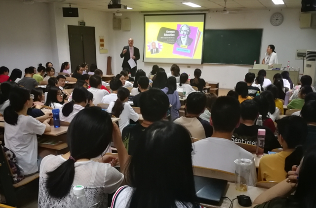 霍斯给同学们介绍了德国的教育政策和教育体系、申请赴德留学的要求以及德国的教育历史、目前实施的9年制义务教育和高等教育概况,还详细介绍了赴德国留学的申请步骤和材料准备等细节。他用风趣幽默的方式与同学们互动,为想赴德国留学的同学们答疑解惑。同学们热情高涨,教室里座无虚席,连过道都坐满了人。
