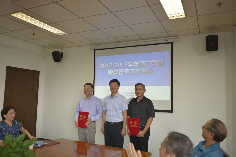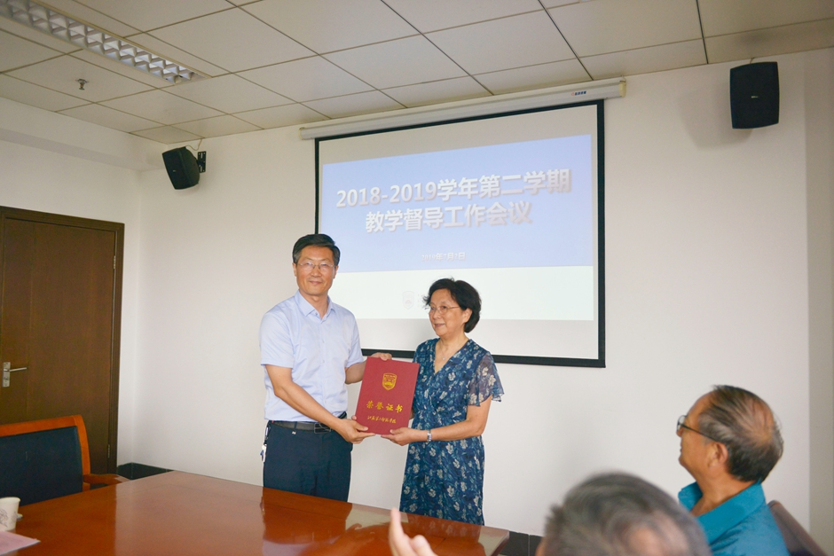 会上,王建为荣退的教学督导熊宁教授颁发荣誉证书,并为新聘的三位教学督导沈明、沈仁国、王高教授颁发聘书。