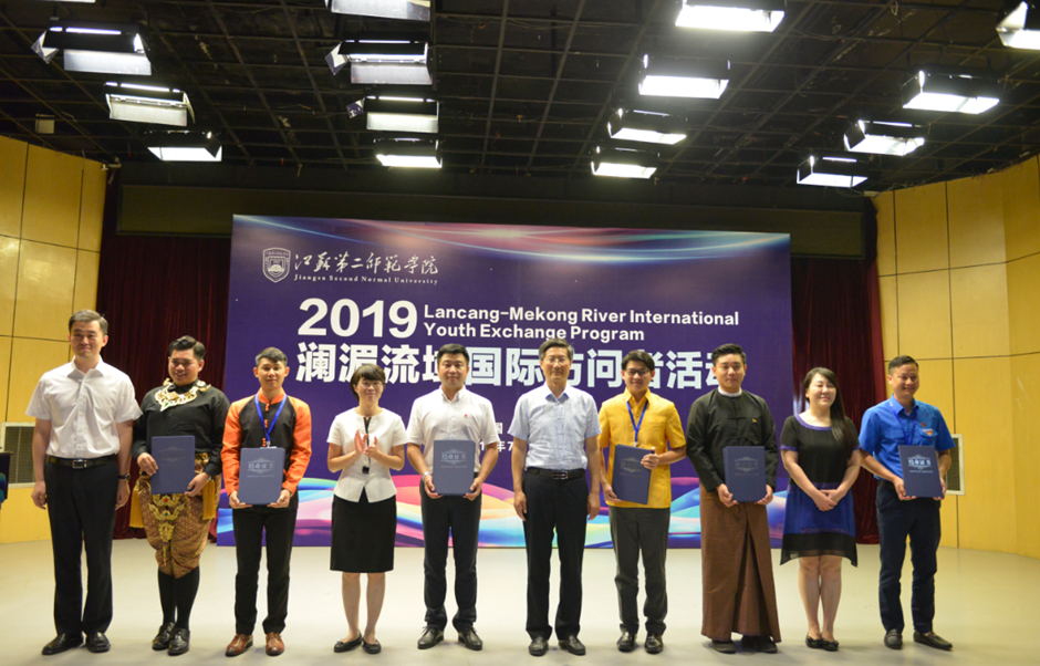 王建对远道而来的澜湄流域六国青年代表们表示热烈欢迎,对加强“一带一路”沿线国际青年的合作充满期待。学前教育学院尹坚勤向与会人员介绍我校和学科发展情况。王建、黄世芳、吕璟、刘继红为六国青年颁发证书并合影留念。