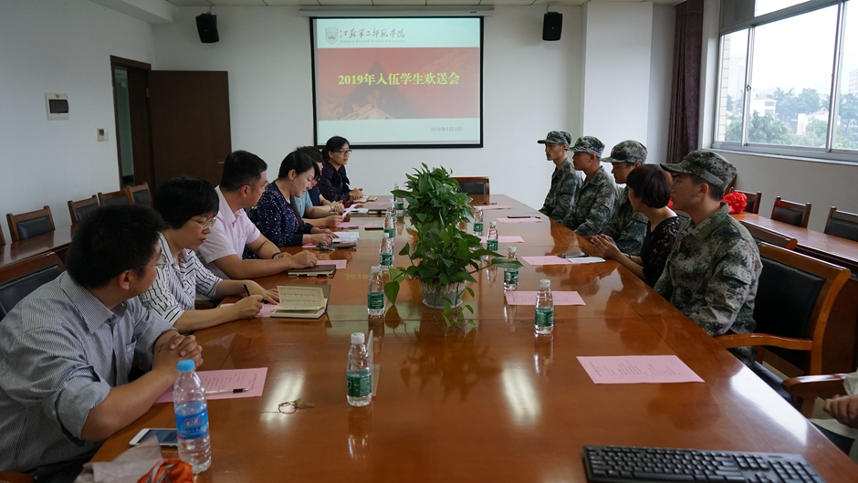 9月2日上午,我校在草场门校区举行2019年入伍学生欢送会,欢送即将奔赴军营的4名热血青年。副校长刘继红出席会议。学工处处长、人武部部长杨思贤,学工处副处长、人武部副部长杨嵘,物理与电子工程学院党总支副书记李佶莲、体育学院党总支书记田磊、物理与电子工程学院辅导员金永生、军事教研室副主任冯丽娜、4名新兵及家长代表参加会议。杨思贤主持会议。