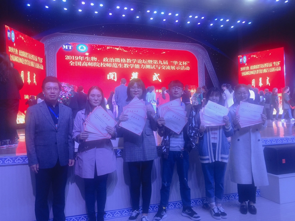 为参加比赛,生化学院进行了严格选拔,选出了2016级生物科学(师范)专业崔金霞、朱魏、陶慧慧、郭紫玥、许靖宇5名师范生,由高学林老师指导,组织进行了3个月的训练。五名学生最终在比赛中取得了较往届更为优异的成绩:在教学技能奖项中,3位同学荣获一等奖,2位同学分别获得二、三等奖,全国排名第八、省内排名第一;在教学设计奖项中,5位同学均获得了一等奖,并列全国排名第一、省内排名第一;在微格教学活动论文(师生同赛)评比中,该院组织了16位同学参赛,4位同学获得一等奖,5位同学获得二等奖,6位同学获得三等奖,全国排名第一、省内排名第一。