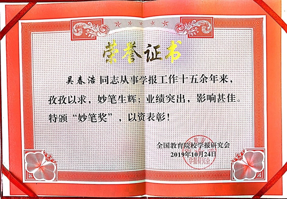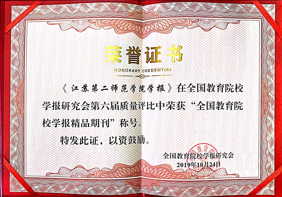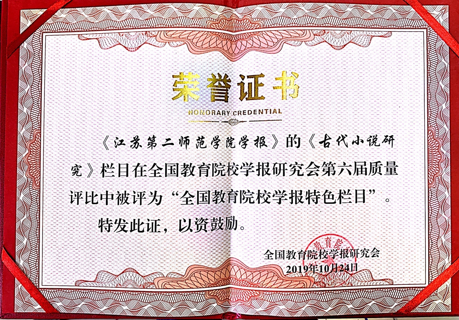 1025日,全国教育院校学报研究会2019年学术年会在成都召开,会议听取了研究会的工作报告,并进行了理事会成员的增补以及第六届期刊质量评比工作。在此次评比活动中,《江苏第二师范学院学报》荣获“全国教育院校学报精品期刊”称号,《古代小说研究》栏目荣获“全国教育院校学报特色栏目”称号,吴春浩同志荣获“妙笔奖”。