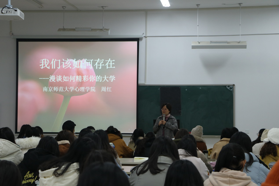 为帮助全体新生明晰未来四年的奋斗目标,指导高年级同学进行合理的学习、工作规划,继续建设学前教育学院奋发向上、精益求精的优良学风,11月26日下午,学前教育学院特邀南京师范大学心理院周红教授来石湫校区开展题为“我们该如何存在——漫谈如何精彩你的大学生活”的主题讲座。