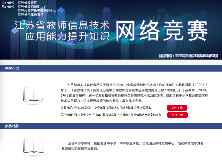 组织本次竞赛旨在贯彻落实《省教育厅关于做好2020年中小学教师和校长培训工作的通知》《省教育厅关于实施江苏省中小学教师信息技术应用能力提升工程2.0的意见》的文件精神,进一步激发和引导教师提升自身信息技术能力的热情,帮助全省中小学教师提高信息技术应用能力,切实提升教师的核心素养。参赛对象为全省中小学教师,包括普通中小学、中等职业学校、幼儿园及教师发展中心、电化教育馆等其他教育机构的在职在岗教师。竞赛试题内容为在线教育技术理论,在线教学指导课程,技术平台和课程资源的获取和使用,常用信息技术办公软件的应用技能、技巧等。