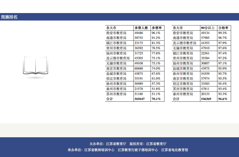 4月28日至5月4日,由省教育厅主办,省教师培训中心、江苏教育行政干部培训中心、省电化教育馆承办的全省中小学(幼)教师信息技术应用能力提升知识网络竞赛在江苏教师教育管理系统平台上成功举行。全省共有565647名教师参加了本次竞赛,参赛率达70.1%,合格率达96.6%。