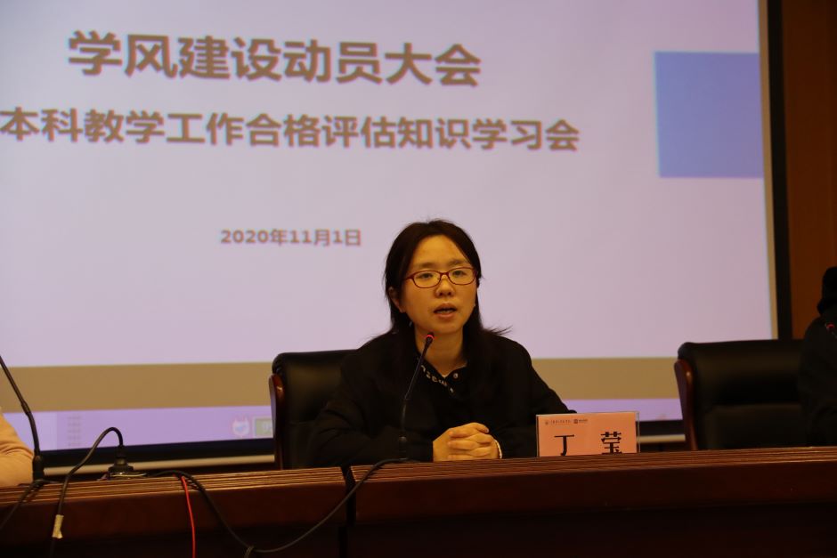 白丽为全体参会学生详细讲解本科教学工作合格评估知识,要求全体学生骨干扎实学习评估知识,并带领班级同学共同学习。