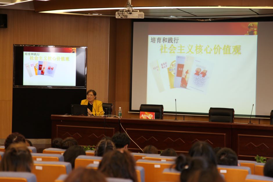 蒋向红以“培育和践行社会主义核心价值观”为主题,从“培育和践行社会主义核心价值观的重大意义”“深刻领会社会主义核心价值观的科学内涵”和“要做社会主义核心价值观的积极践行者”三个方面来阐述。她阐述了凝练社会主义核心价值观的重大意义:一是抵制西方资本主义价值观的需要;二是增强中华民族的凝聚力、促进大国崛起的需要;三是发展社会主义经济市场的需要;分析了社会主义核心价值观的三个层面内容:国家层面、社会层面、公民个人层面;要求青年学生用实际行动,做社会主义核心价值观的积极践行者。
