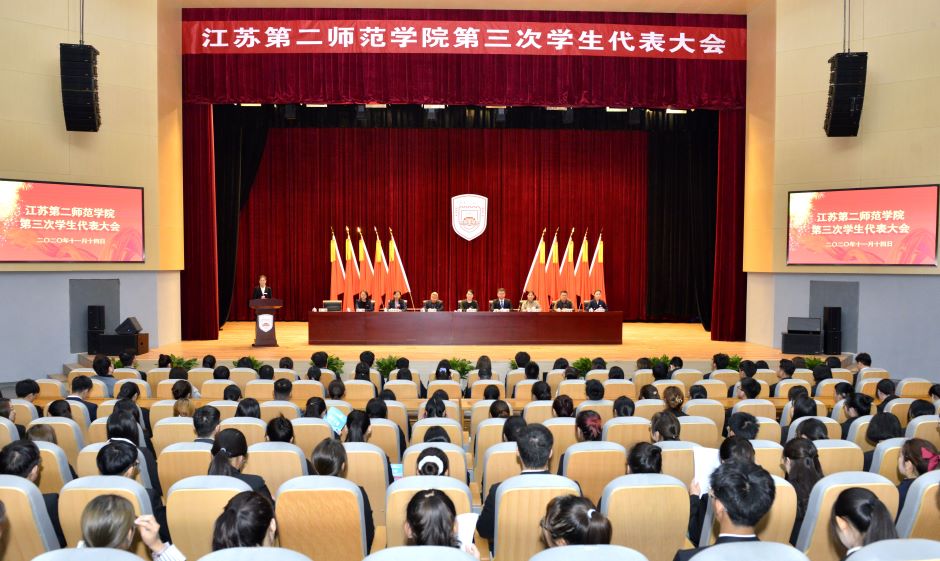 11月14日下午,江苏第二师范学院第三次学生代表大会在石湫校区尚美楼演奏厅隆重召开。校党委副书记、副校长刘继红,江苏省学联驻会主席俞特,校组织部部长刘守旗,宣传部部长卜玉平,教务处处长徐新萍,学工处处长杨思贤,团委书记刘姝,南京师范大学学生会主席周雨洁,以及我校各学院团委书记应邀到会。187名学生代表参加大会。会议由校学生会执行主席陈楠主持。