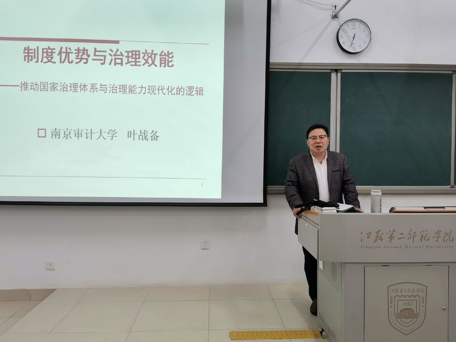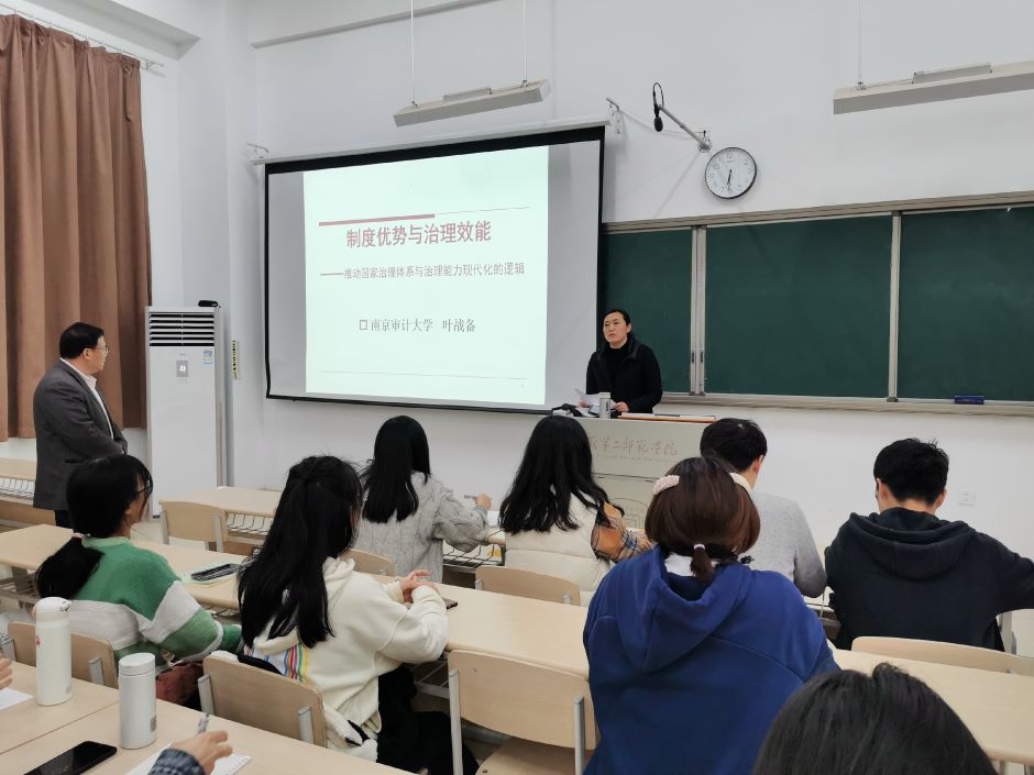 11月22日晚,马克思主义学院邀请南京审计大学叶战备教授来院,在博学楼1-108作题为《制度优势与治理效能——推动国家治理体系与治理能力现代化的逻辑》的学术讲座。该院院长刘素梅主持活动,120多名学生参加活动。