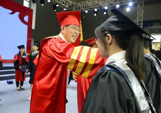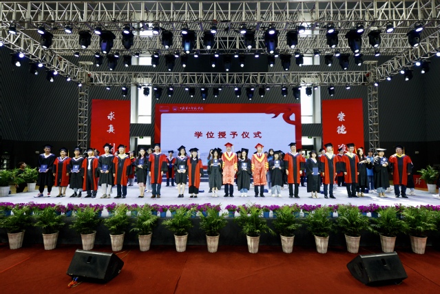 仪式最后,江苏二师校领导、二级学院负责人、主要职能部门负责人为全体毕业生颁发毕业证书,为每一位学士学位获得者扶正流苏、授予学位证书并合影留念。