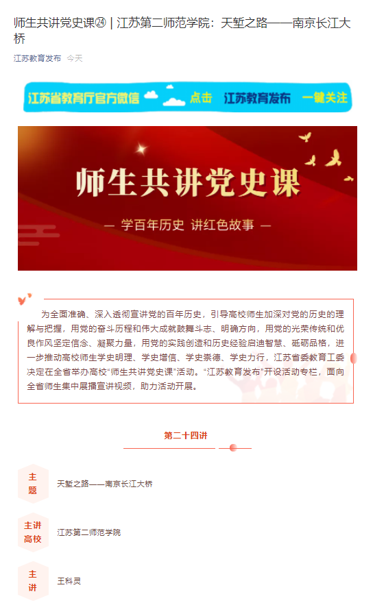 为全面准确、深入透彻宣讲党的百年历史,引导高校师生加深对党的历史的理解与把握,用党的奋斗历程和伟大成就鼓舞斗志、明确方向,用党的光荣传统和优良作风坚定信念、凝聚力量,用党的实践创造和历史经验启迪智慧、砥砺品格,进一步推动高校师生学史明理、学史增信、学史崇德、学史力行,江苏省委教育工委决定在全省举办高校“师生共讲党史课”活动。“江苏教育发布”开设活动专栏,面向全省师生集中展播宣讲视频,助力活动开展。