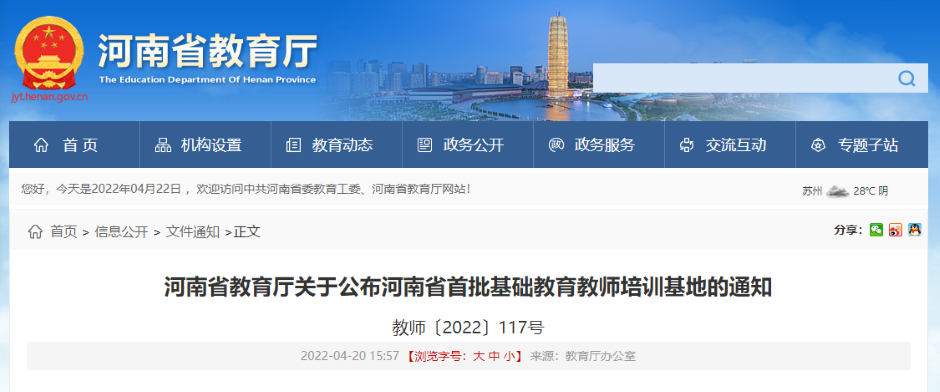 近日,从《河南省教育厅关于公布河南省首批基础教育教师培训基地的通知》(教师〔2022〕117号)文件获悉,我校成功获批河南省首批基础教育教师培训基地。