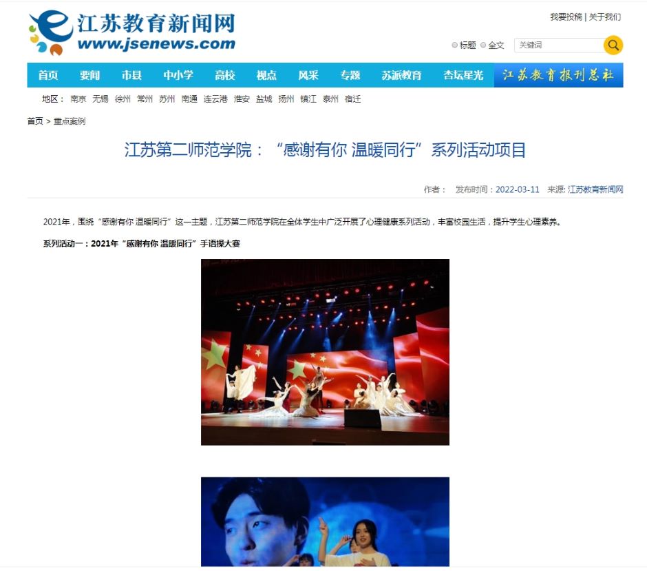 日前,我校大学生心理健康教育中心申报的2021年“感谢有你 温暖同行”系列活动项目入选“感谢有你,温暖同行——大学生心理健康教育江苏行”主题教育活动重点案例。