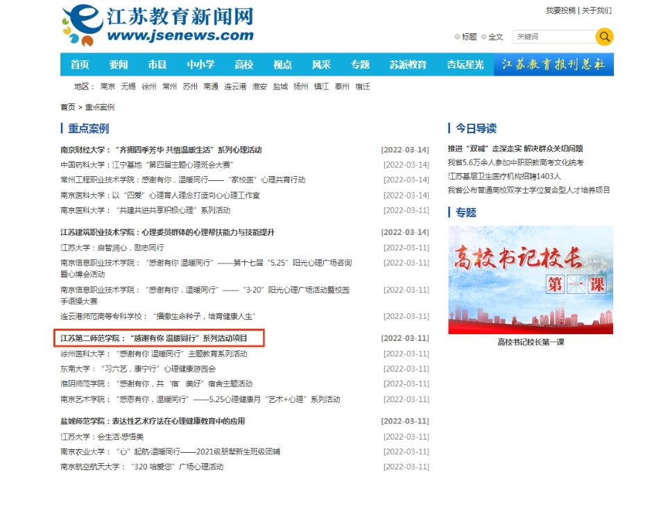 由江苏省教育厅(高校学生处)指导,江苏教育报刊总社(省教育厅教育宣传中心)主办的“感谢有你,温暖同行——大学生心理健康教育江苏行”主题教育活动优秀项目案例征集活动,面向全省高校、基地和示范中心征集主题教育活动优秀项目案例,此次活动共遴选出19个重点案例和22个优秀案例。