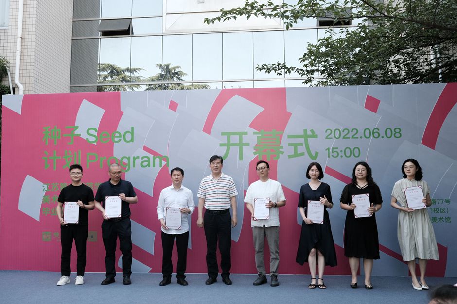 6月8日下午,美术学院在草场门校区蒙玛特美术馆举办“2022种子计划毕业汇报展”开幕式。党委书记王仁雷、副校长祝兴成、宣传部部长卜玉平以及党办校办主任张其飞、学工处处长杨思贤、教务处副处长王玉玺,南京艺术学院科研处处长吕少卿、艺术教育高等研究院院长顾平,江苏省美术家协会雕塑艺委会副主任兼秘书长、南京师范大学美术学院教授陈亮,蒙玛特(中国)总经理张啟鑫、副总经理马先明,美术学院老教授、“黄显之艺术奖学金”捐赠人、校教学督导黄载文等出席开幕式。美术学院院长路明主持开幕式。美术学院党总支书记丁莹、副院长陶金鸿、党总支副书记孙仕荣与该院全体教师、2022届毕业生代表参加开幕式。