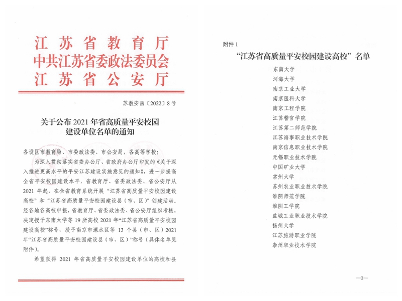 近日,省教育厅、省委政法委、省公安厅联合发布《关于公布2021年省高质量平安校园建设单位名单的通知》,授予我校2021年“江苏省高质量平安校园建设高校”称号。
