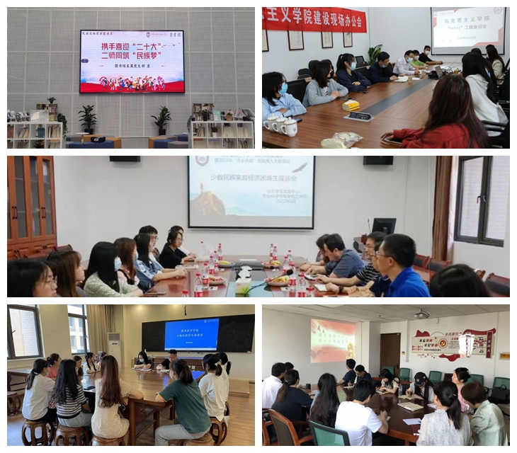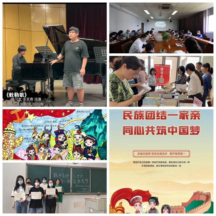 各单位以“携手喜迎二十大,同心共筑教育梦”为主题,注重发挥校园文化作用,结合各部门和民族学生特点,开展了丰富多彩的活动。马克思主义学院以学校“1+1+1”助力学生成长成才工程为契机,开展中层干部重点帮扶藏族学生多杰才仁活动;美术学院举办主题书画比赛,用笔表达爱国主义精神和民族团结进步精神;音乐学院结合毕业演出,排演了新疆、云南等地的民族舞蹈、民族歌曲演唱、民族音乐器乐演奏等节目,将传统民族音乐的教学与实践紧密结合,深入开展爱国主义教育与民族政策教育;商学院开展“聚焦主线谱新篇,同心筑梦向未来”民族团结主题征文活动,以故事悟思想,助团结共筑梦;数信学院开展“民族大团结”海报设计活动,营造氛围,进一步唱响民族团结主旋律;马克思主义学院、生化学院、传媒学院、教育科学学院、城环学院等召开少数民族学生代表座谈会,帮助少数民族学生更好地投入校园学习与生活;图书馆开展“党员送民族团结类图书至教工身边”活动,通过在教工食堂现场办理图书借阅的方式宣传民族工作。
