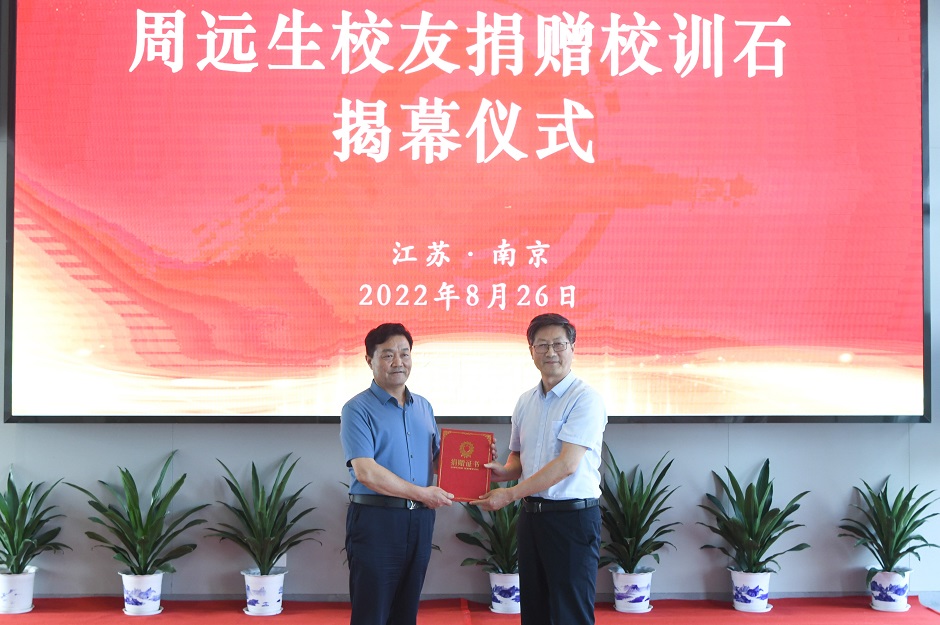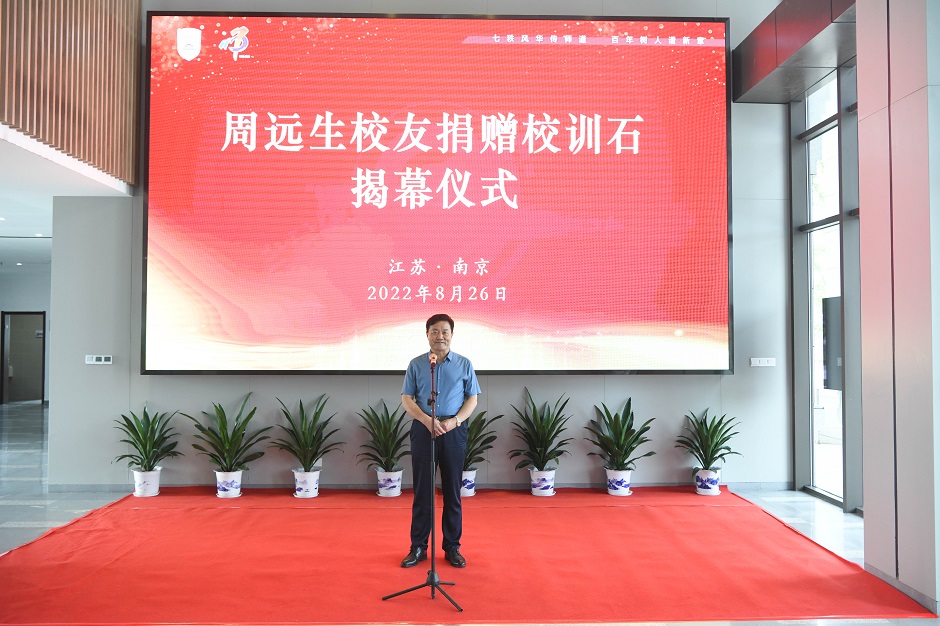 王仁雷代表学校对周远生不忘初心、回馈母校的捐赠之举表示诚挚的谢意。他指出,校训是一校之魂,是学校办学理念、治校精神的体现,是学校人文精神的高度凝练和发展历史的真实写照。校训石的落成,不仅将成为我校一处重要地标、一道美丽风景,更将时刻激励师生员工把校训精神内化于心,践之于行,不断增强爱校兴校的责任感、使命感。