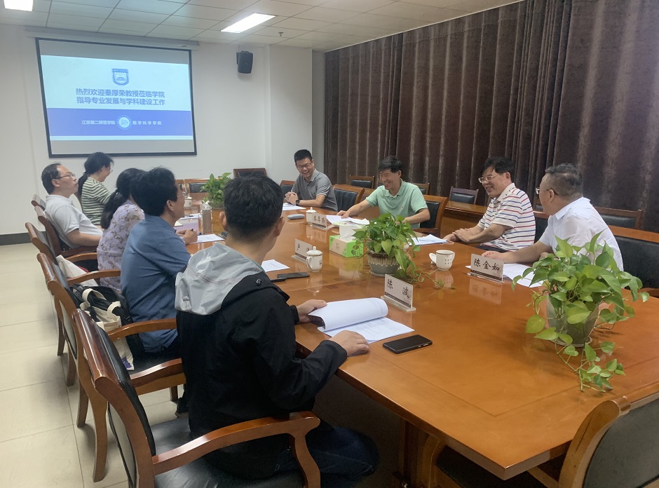 9月15日下午,我校杰出校友、国务院学位委员会第八届数学学科评议组成员、教育部数学类专业教学指导委员会委员、南京大学秦厚荣教授应江苏第二师范学院的邀请,来校做数学与应用数学国家一流专业建设指导。校党委书记王仁雷热情会见并与之进行亲切交谈。副校长陈金如、副校长刘贵友、科研处处长章飞、原教务处处长徐新萍教授以及数学科学学院班子成员参会。会议由陈金如主持。