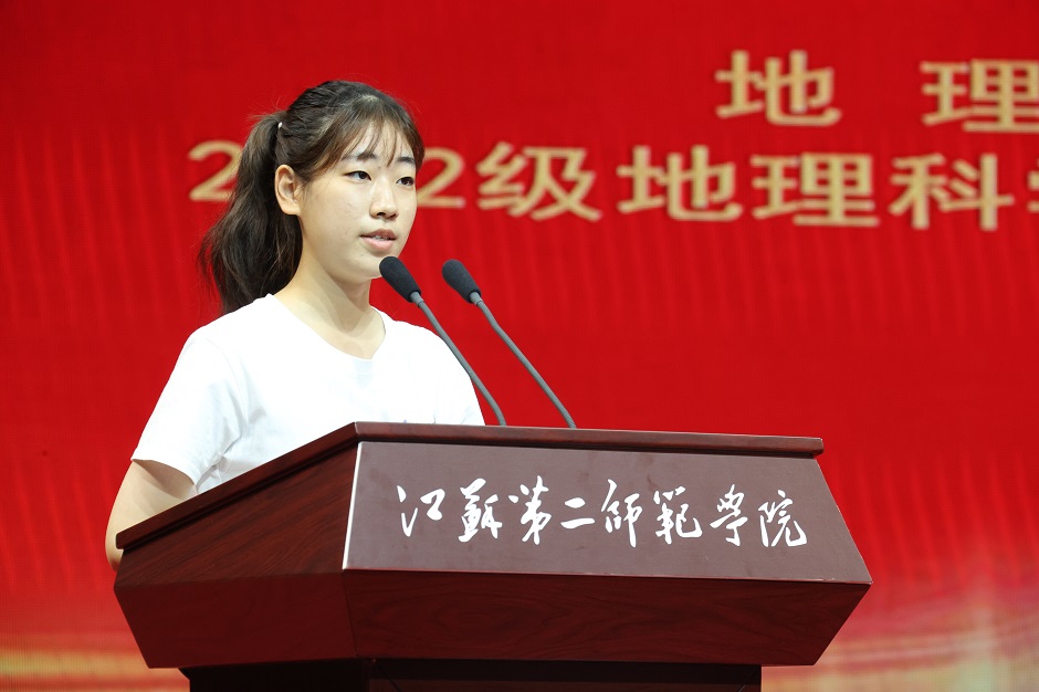 新生代表、地理科学学院2022级地理科学普本(师范定向)班张苑秋同学,生命科学与化学化工学院2022级生物制药专转本班李高璟同学分别发言,他们分享了初次踏进江苏二师校园的感受,希望大家做到立大志、明大德、成大才、担大任,共同创造属于自己和二师的荣耀。