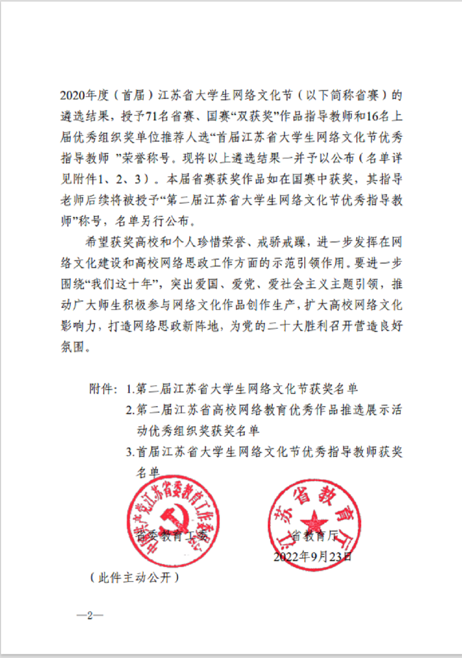 近日,江苏省委教育工委、省教育厅公布第二届江苏省大学生网络文化节和高校网络教育优秀作品推选展示活动获奖结果。我校师生在活动中荣获佳绩,其中二等奖1项、三等奖3项、优秀指导教师荣誉称号1项。
