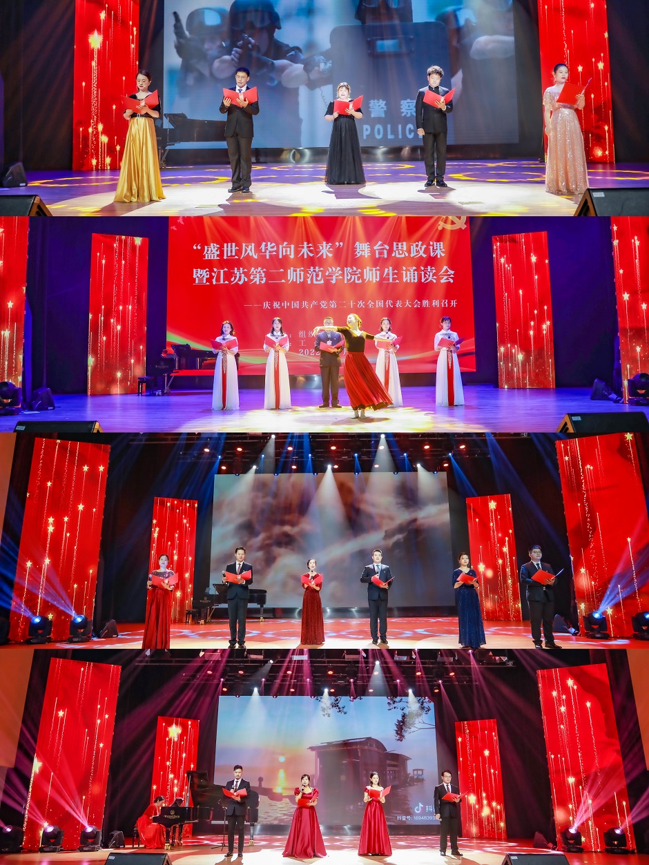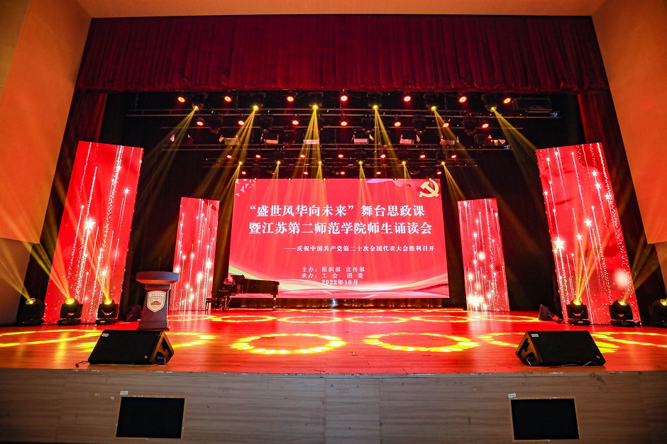 金秋十月,丹桂飘香。27日下午,我校在石湫校区尚美楼报告厅举办“盛世风华向未来”舞台思政课暨师生诵读会,庆祝党的二十大胜利召开。该活动由组织部、宣传部主办,工会和团委承办。校党委书记王仁雷,校长王建,校领导刘继红、潘文、祝兴成、崔燕、姚振标、陈金如、刘贵友等出席诵读会。相关职能部门负责人、机关党委各支部代表和学生代表参会。诵读会由党委副书记潘文主持。