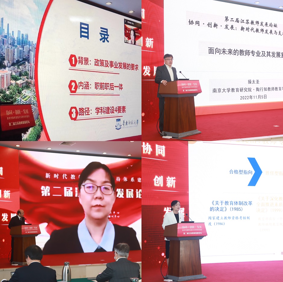 为深入学习贯彻党的二十大精神,全面落实《新时代基础教育强师计划》要求,加快江苏高素质专业化创新型教师队伍建设进程,在我校建校70周年之际,由师干训中心主办的第二届江苏教师发展论坛于11月5日在南京举行。教育部教师工作司副司长(援青)、青海省教育厅副厅长宋磊,江苏省教育厅副厅长潘漫,我校党委书记王仁雷,我校副校长陈金如,江苏省教育厅教师工作处副处长杨菲菲出席开幕式。来自全国各级教育行政部门领导、教师发展机构培训专家、高等院校教师教育专家、江苏中小学学校校长及骨干教师代表参加本次论坛。本次论坛围绕“新时代教师发展与支持体系建设”主题,直面教师队伍建设的热点、难点问题,广泛交流、深入研讨,打造全省教师教育的知识生产与创新平台,推动江苏教师队伍高质量发展。开幕式由副校长陈金如主持。