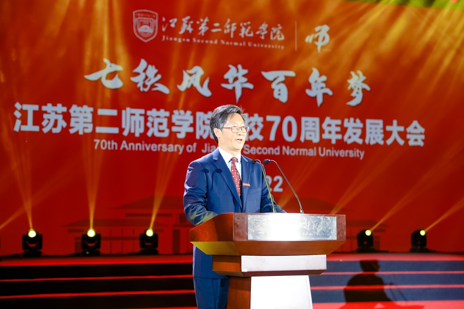 笃行七秩,行远自迩。校长王建向长期以来对学校建设发展给予指导帮助和关心支持的教育部、省委省政府、省教育厅、南京市和鼓楼区、溧水区相关领导以及兄弟高校和社会各界同仁表示衷心的感谢。他表示,我们深切怀念每一位呕心沥血、鞠躬尽瘁的先驱,诚意致敬每一位勤勉敬业、拼搏进取的校友,由衷礼赞每一位勠力同心、不懈奋斗的师生。他指出,建校以来,江苏二师始终高举师范大旗,与民族复兴同向同行、与教育事业同频共振。江苏二师的七十年,是爱国敬业的七十年,是艰苦奋斗的七十年,是守正创新的七十年。七十年积淀的宝贵精神财富,是我们穿越风雨、历久弥新的精神密码,激励着全体江苏二师人乘风破浪、阔步向前。