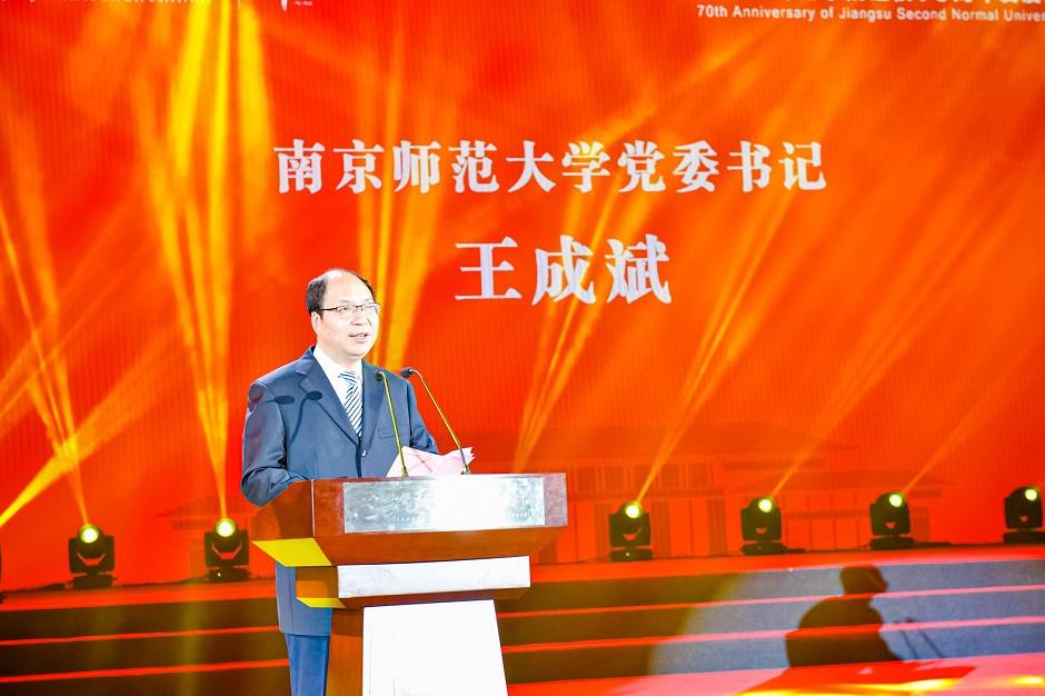 南京师范大学党委书记王成斌致辞,向江苏二师建校七十周年表示热烈的祝贺。他指出,七十年来,江苏二师坚守为党育人初心,践行为国育才使命,为江苏乃至全国的基础教育事业和经济社会发展输送了一大批优秀人才,作出了重要贡献。他表示,两校根脉相连、文化相通,在长期的合作办学进程中,建立了情同手足的深厚情谊,希望两校加强合作、携手共进,为江苏教育强省建设和我国高等教育事业发展,为全面建设社会主义现代化强国作出新的更大贡献。