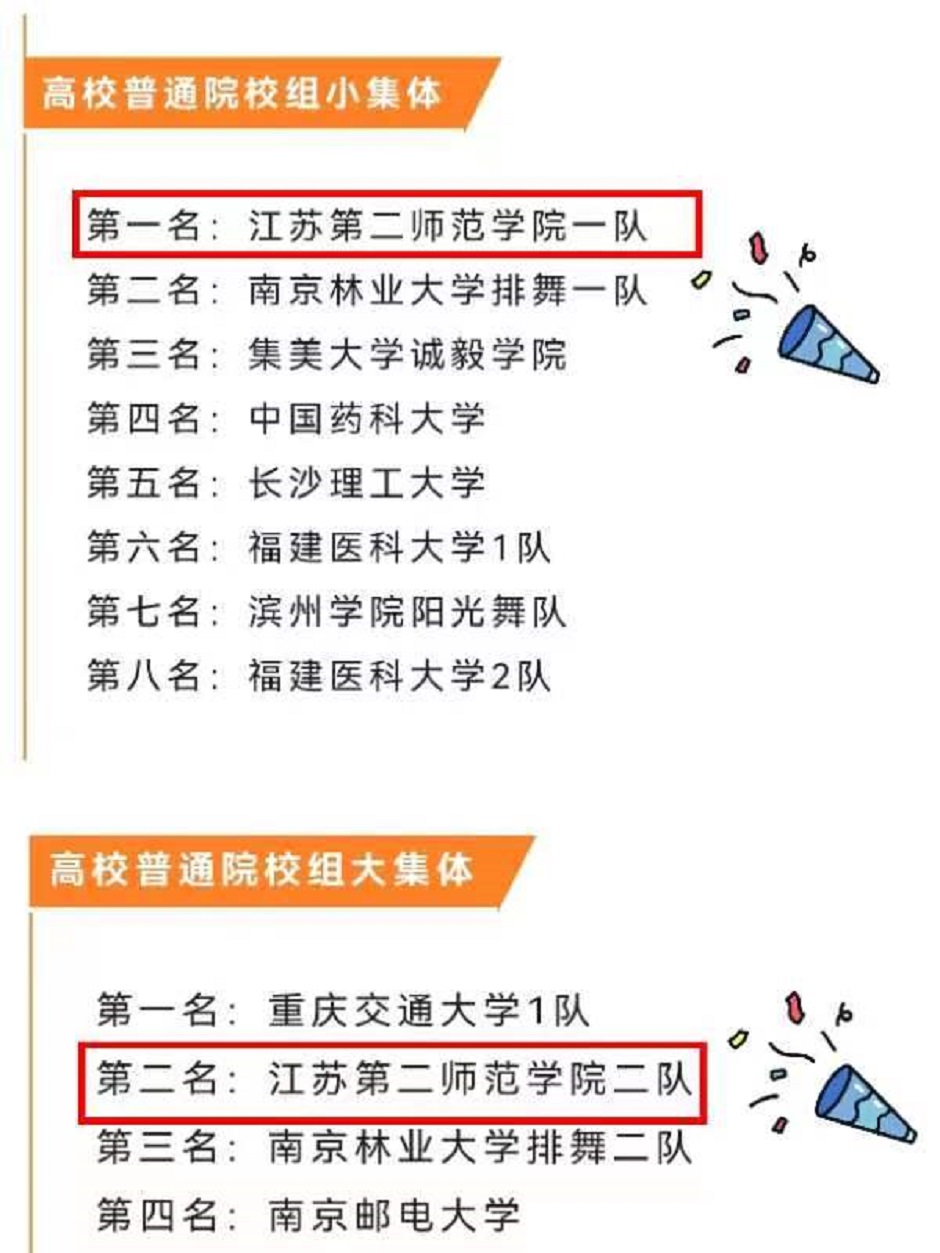 我校39名参赛运动员参加了此次比赛,最终获得单项奖8项第一名,1项第二名和1项第三名的优异成绩,并获得高校普通院校组小集体团体总分第一名、高校普通院校组大集体团体总分第二名。作为江苏省排舞首所五星级示范学校,我们要勇担新时代使命任务,为把我国建设成为体育强国而努力。