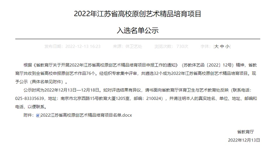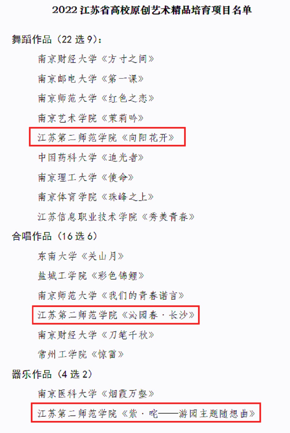 12月13日,江苏省教育厅公布了2022年江苏省高校原创艺术精品培育项目入选名单,我校申报的三个作品:舞蹈作品《向阳花开》、合唱作品《沁园春·长沙》、器乐作品《紫·咤——游园主题随想曲》全部成功入选。在本次原创艺术精品培育项目活动中,江苏省教育厅共收到全省高校原创艺术作品76个,经专家评审,共遴选32个成为2022年江苏省高校原创艺术精品培育项目。
